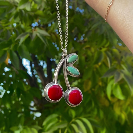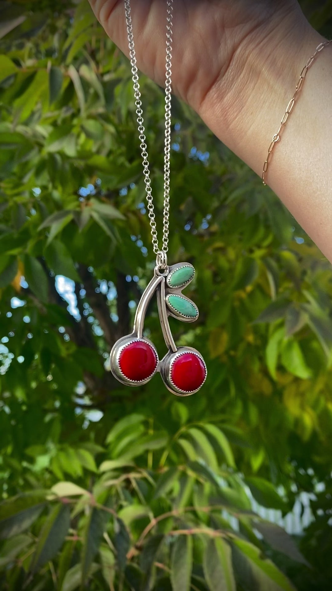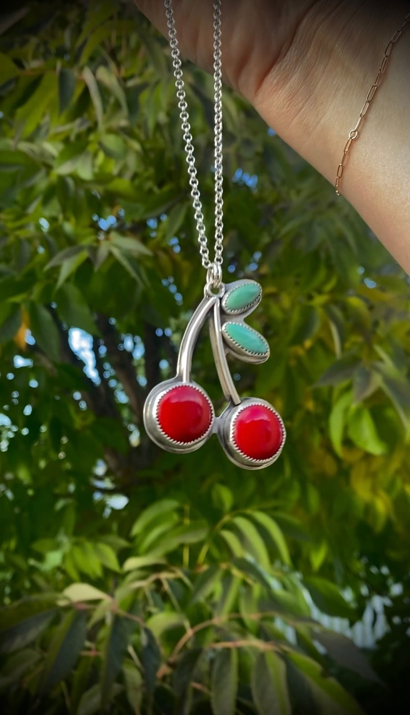 A huge labor of love - A cherry pendant 100% made from scratch with so much love! Two rosarita stones make up the cherries & there are two lucin turquoise leaves π This is definitely a unique heirloom piece that will stand out from the rest. The pendant is hanging from 17.5 inches of 2.5mm rolo chain, but can hang form any chain if you prefer a chain of your own.Β