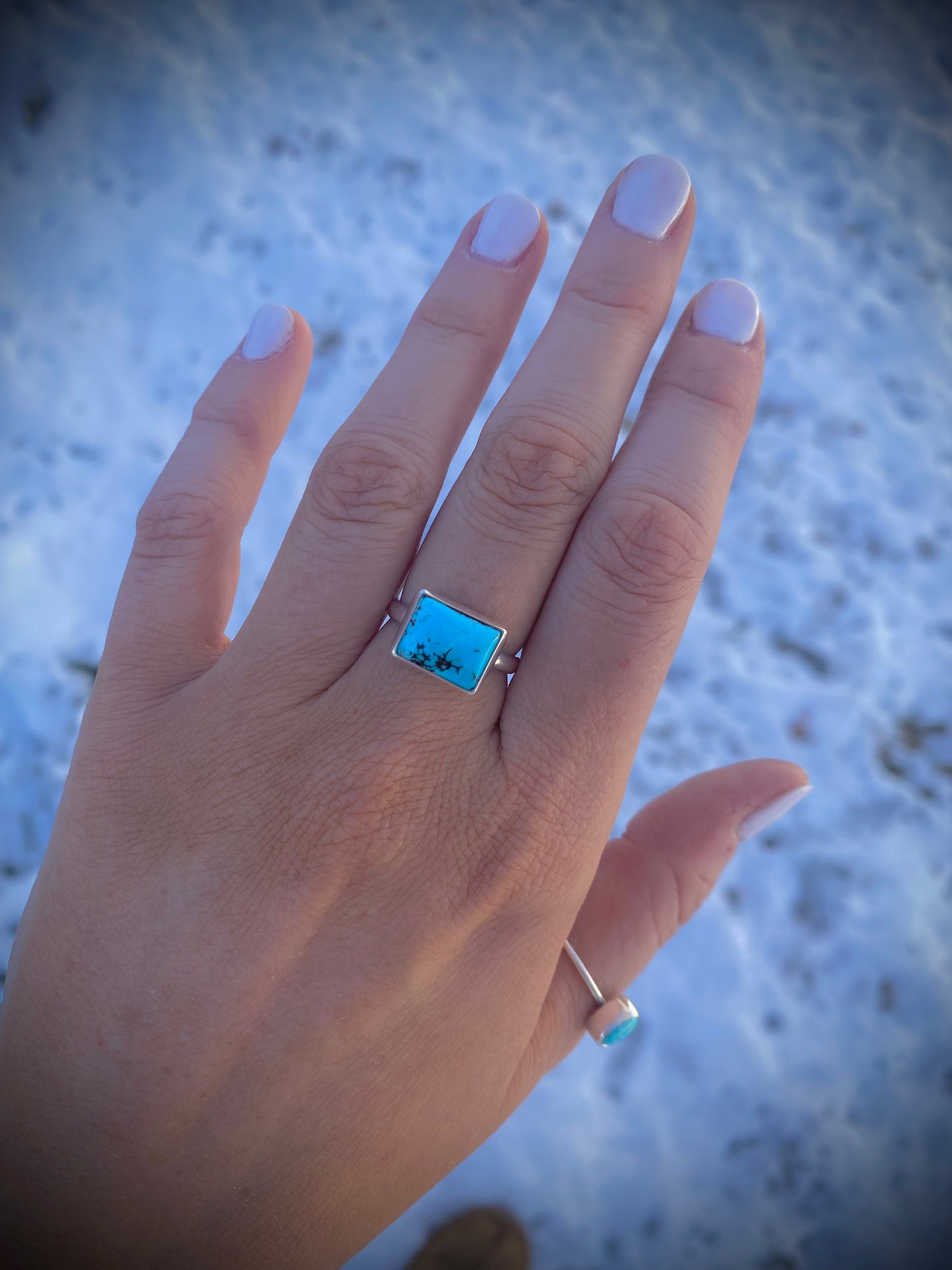 All natural, vibrant blue turquoise set in a classic bezel & attached to a 10g half round ring band. Size 7.