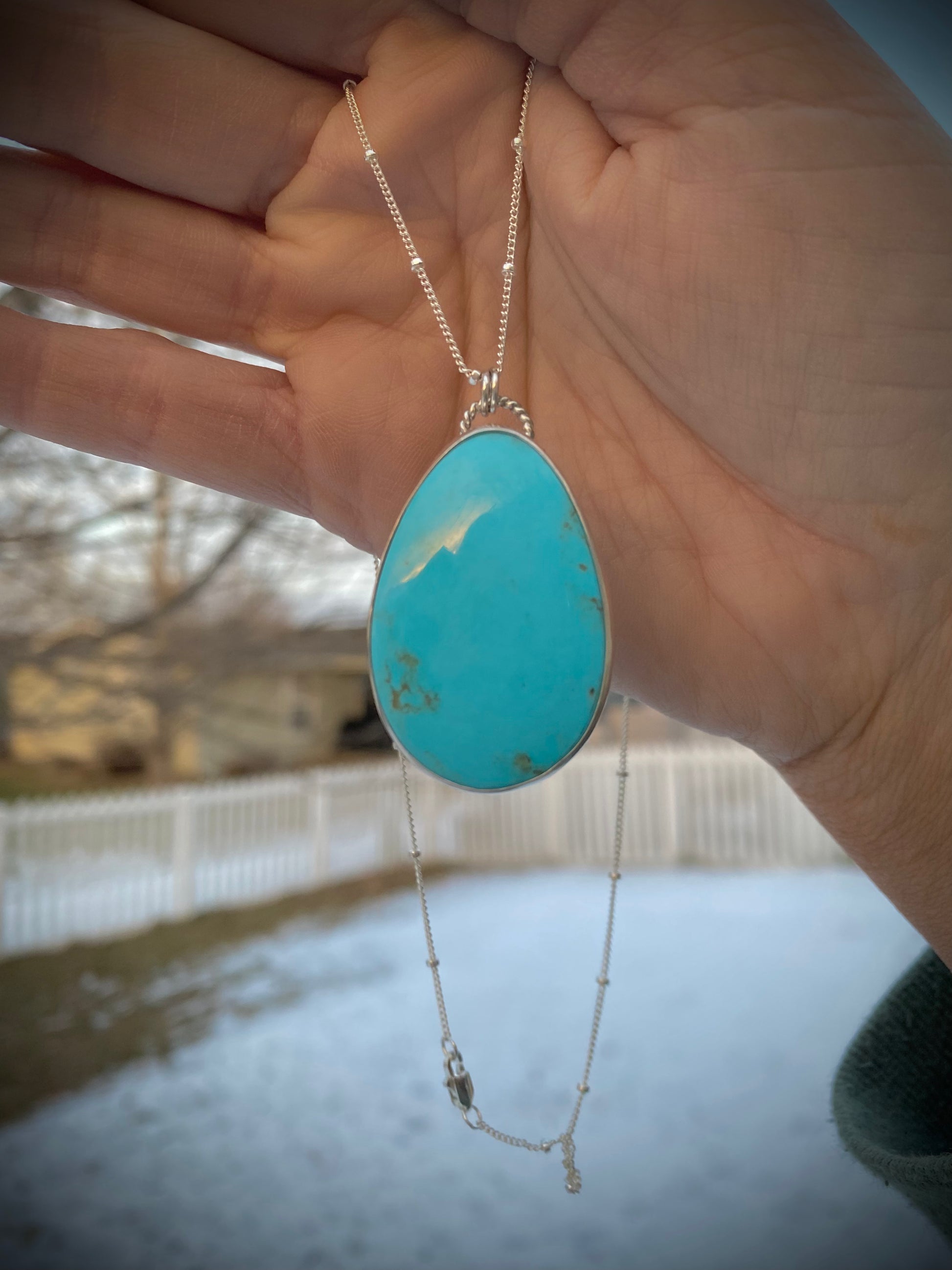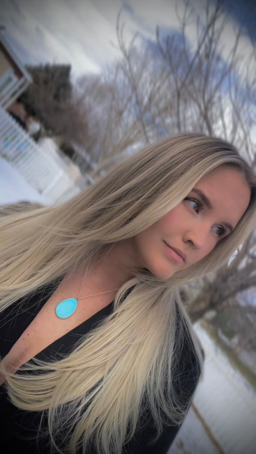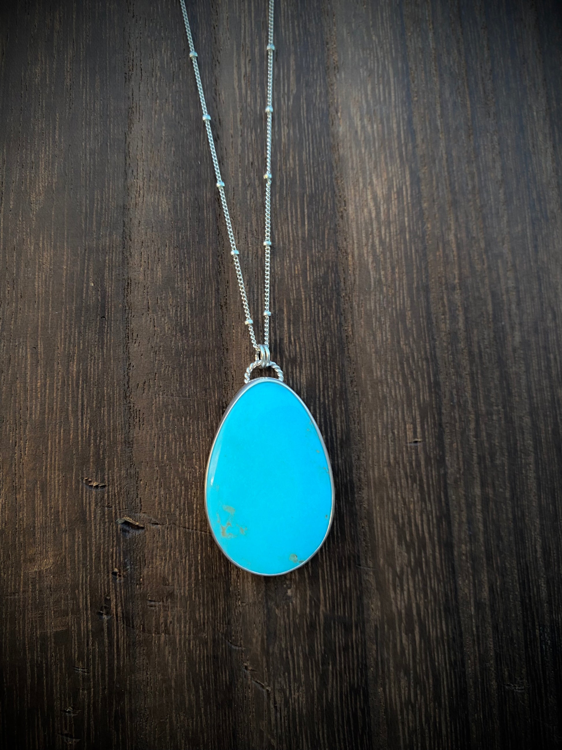 A stunning every day statement necklace - vibrant blue campitos turquoise, set in a classic bezel. The pendant is hanging from an 18 inch satellite chain with a lobster clasp.Β