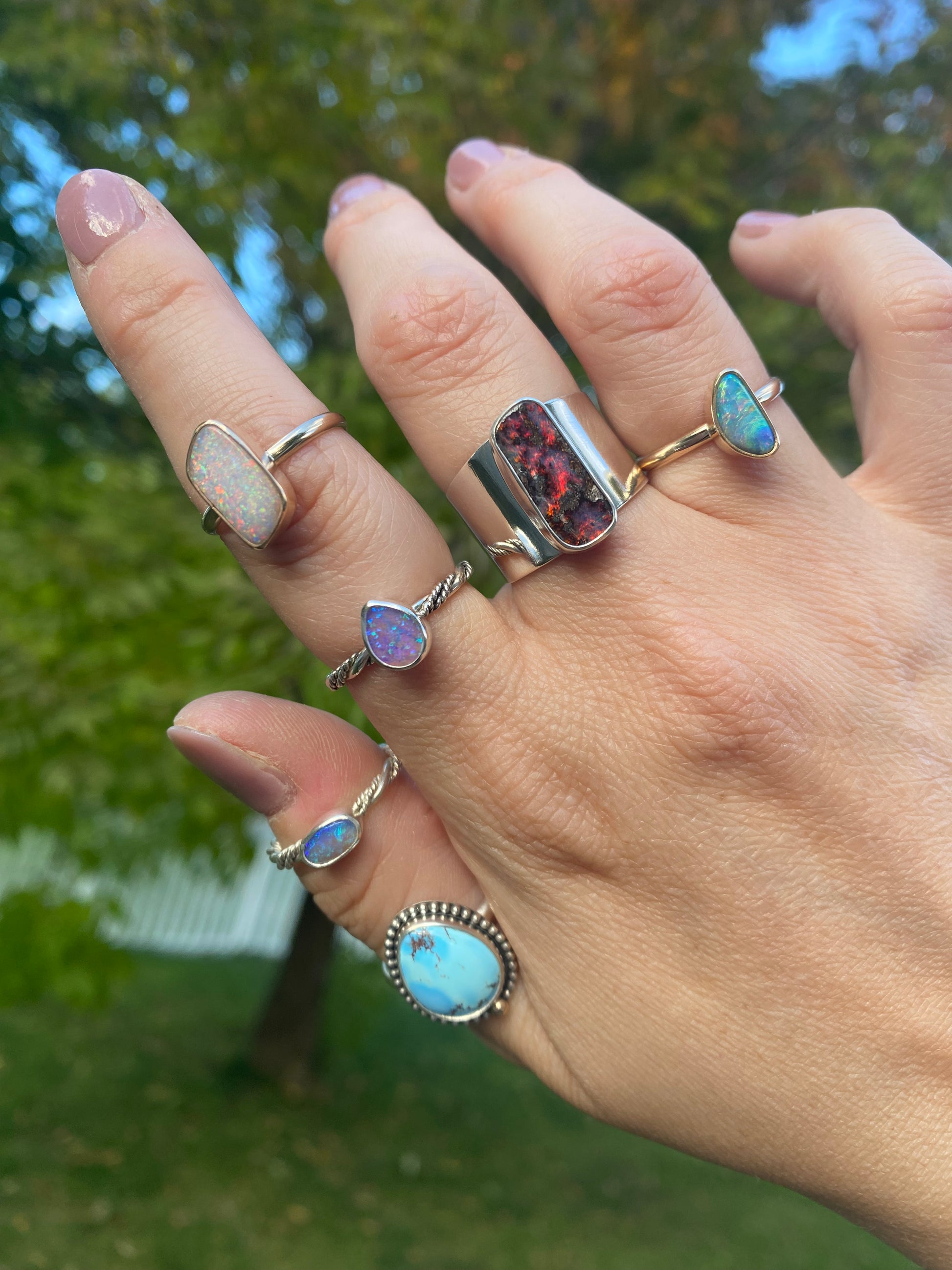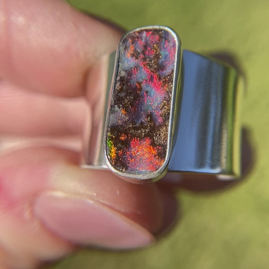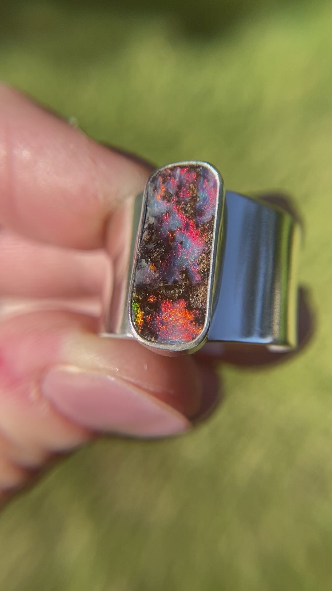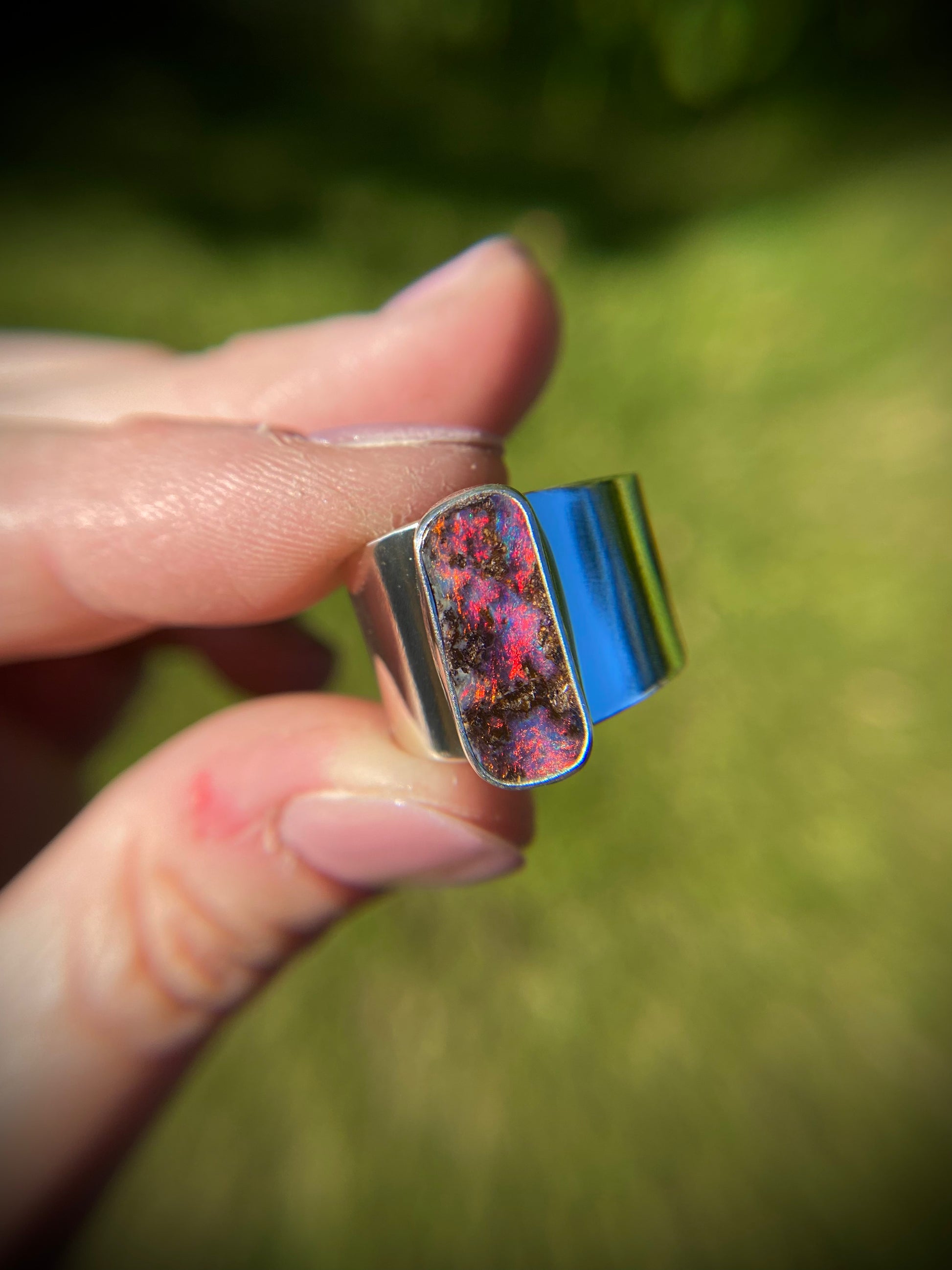 A solid Australian boulder opal filled with vibrant hot pink shimmer, set in a classic bezel atop a thick tapered ring band. The ring band is sawed, filed, shaped by hand & polished with a shiny mirror finish. Size 7.75 but fits like a size 7.25-7.5 due to the thick band.