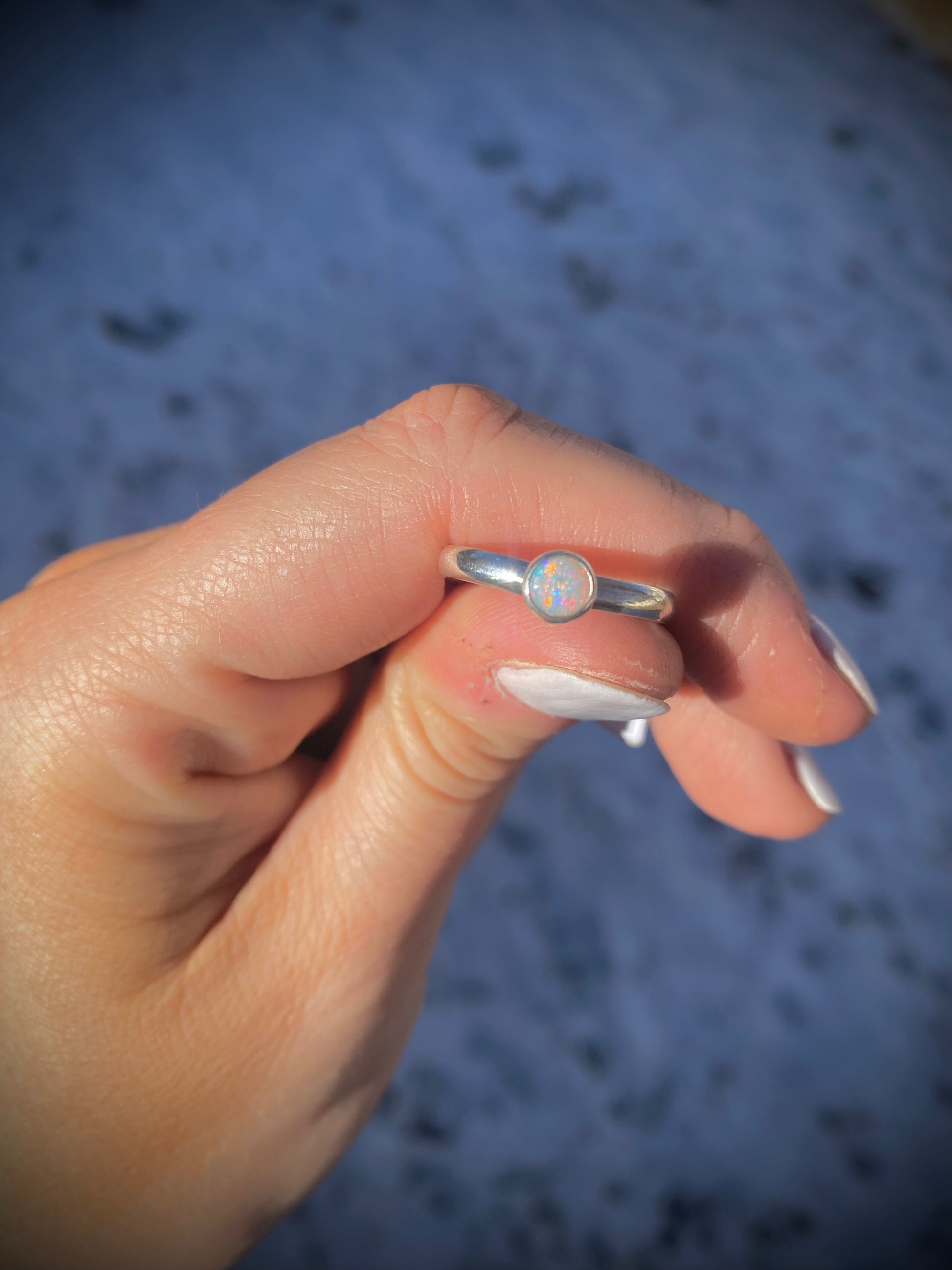 A 5mm Australian crystal opal attached to a 10g half round ring band. Size 7.