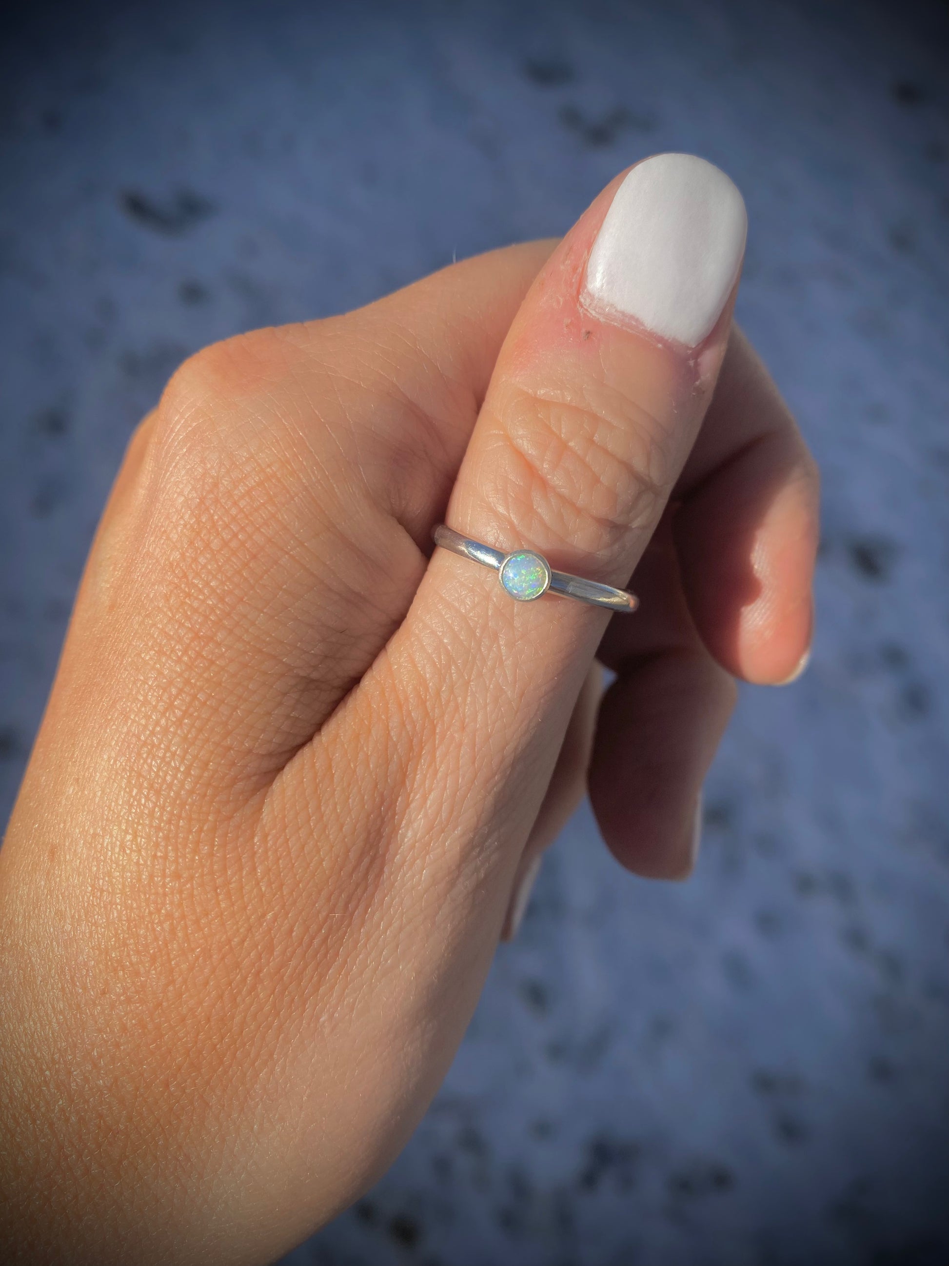 A 4mm Australian crystal opal attached to a 12g half round ring band. Size 8.5.