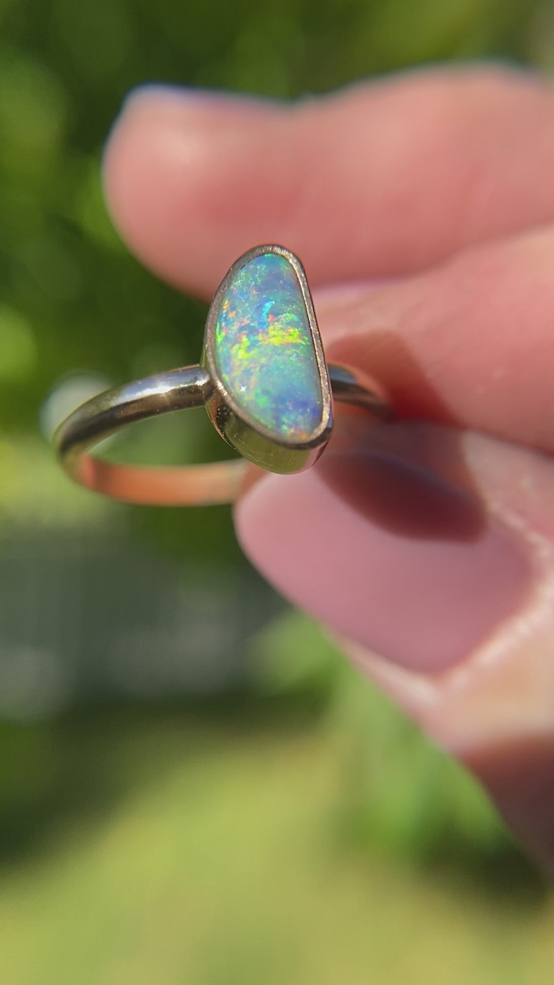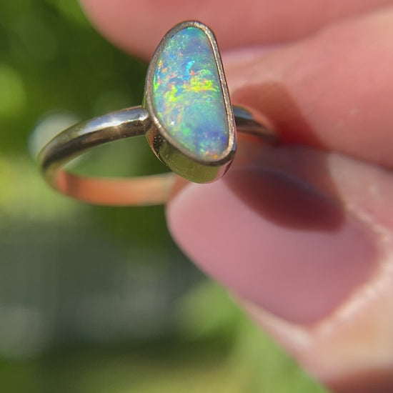 An all natural Australian boulder opal filled with swirls of color. Tucked inside a 14K bezel with a silver backplate & attached to a 12g half round band that is also solid 14k gold. Size 6.