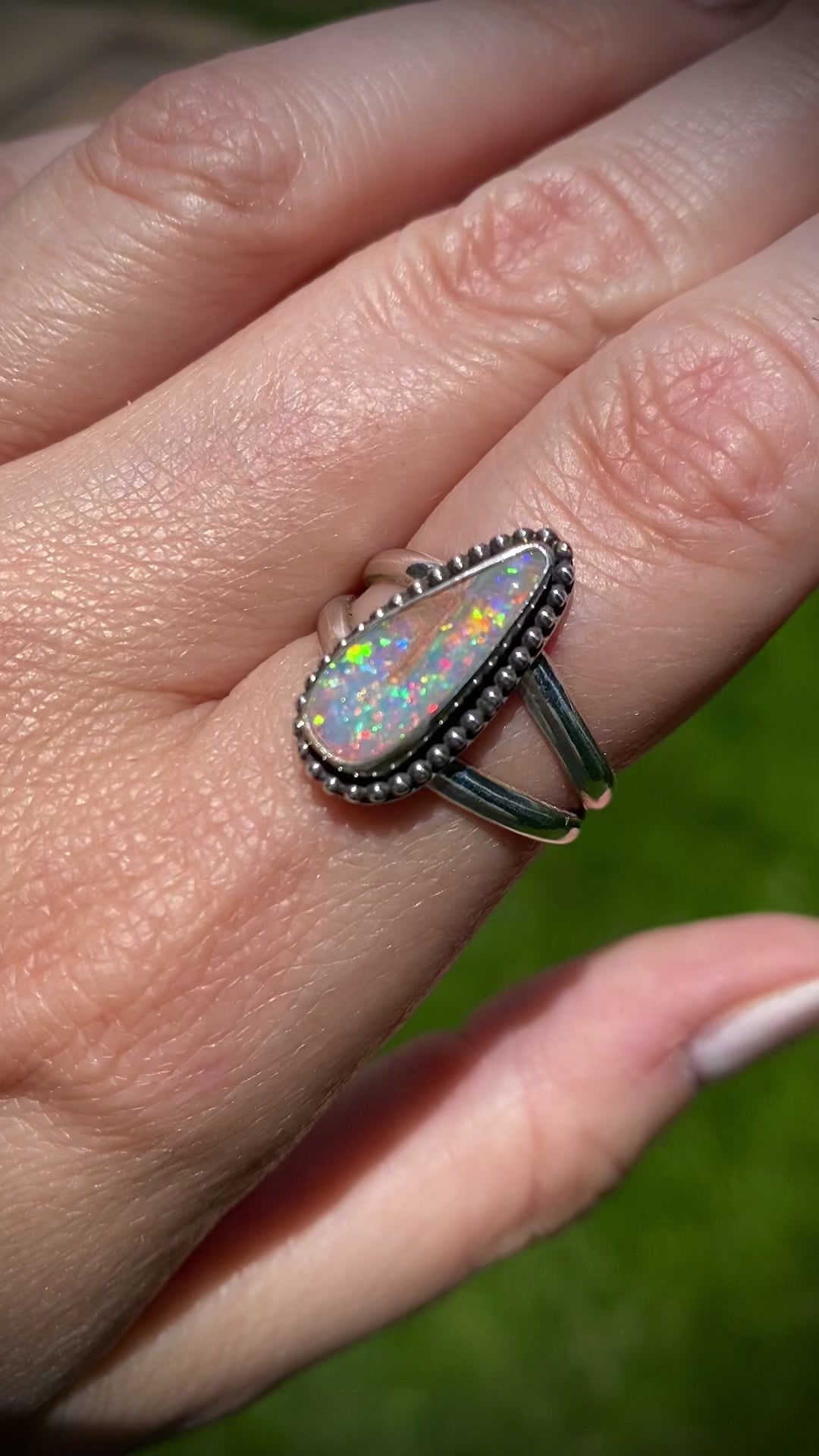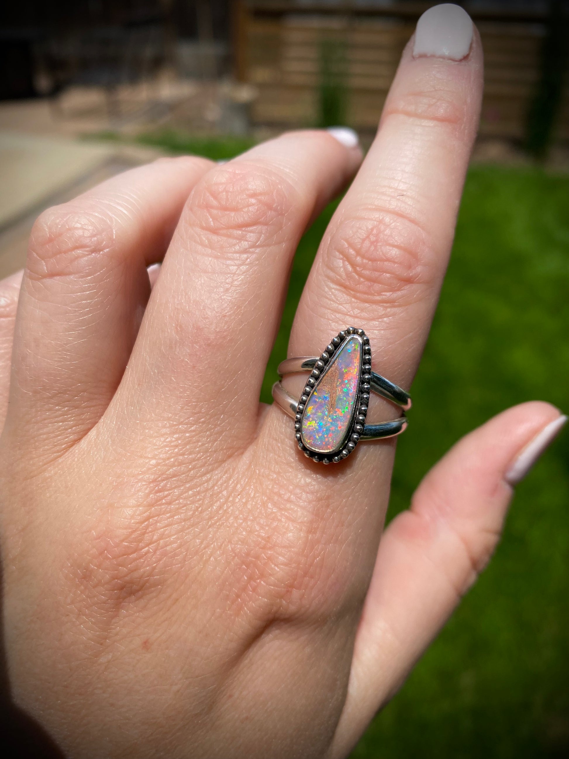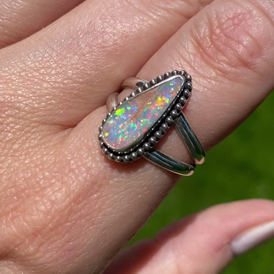 A solid Australian pipe opal with tons of rainbow pixie dust & pink sparkle that always pops. She is set in a classic bezel with a beaded border & attached to a split ring shank. Size 8.5.